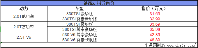 上汽大众途昂X于今天(5月28日)正式上市,售价为31.69-48.89万元。和途昂一样,途昂X共有2.0T低功率(330TSI)、2.0T高功率(380TSI)和2.5T V6(530 V6)这三种动力,共计6款车型,并将有6种车身颜色可选。