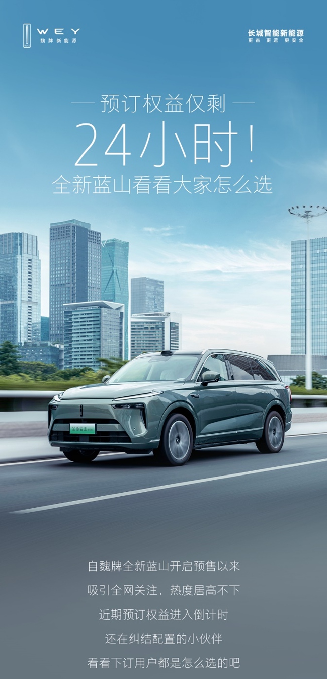 8月21日魏牌全新蓝山上市,预订权益正式进入倒计时,截止8月21日18:00前,可以在魏牌新能源官方APP、小程序等渠道下订。下订用户可享至高价值39000元预售权益,含现金抵扣礼(2000元抵10000元购车款),高阶智驾礼(价值26000元城市NOA智驾功能终身免费,高速NOA功能终身免费),现在还有现时权益加码,可再享5000元选装基金。还在纠结配置的用户,抓紧下订吧。