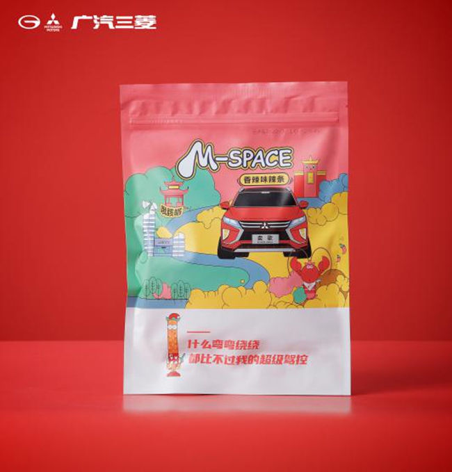 在现场,广汽三菱也正式公布了此次推出的跨界新品——广汽三菱辣条,并将其命名为“SPICY ENERGY BAR”,把畅享辣趣的四大口味场景与品牌四大明星车型相结合,完美诠释了激发生活创造力的“辣能量”。