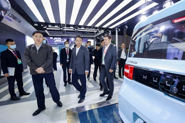 (工信部装备工业一司副司长陈克龙、四川省经济和信息化厅总工程师黄灵参观上汽通用五菱展台)