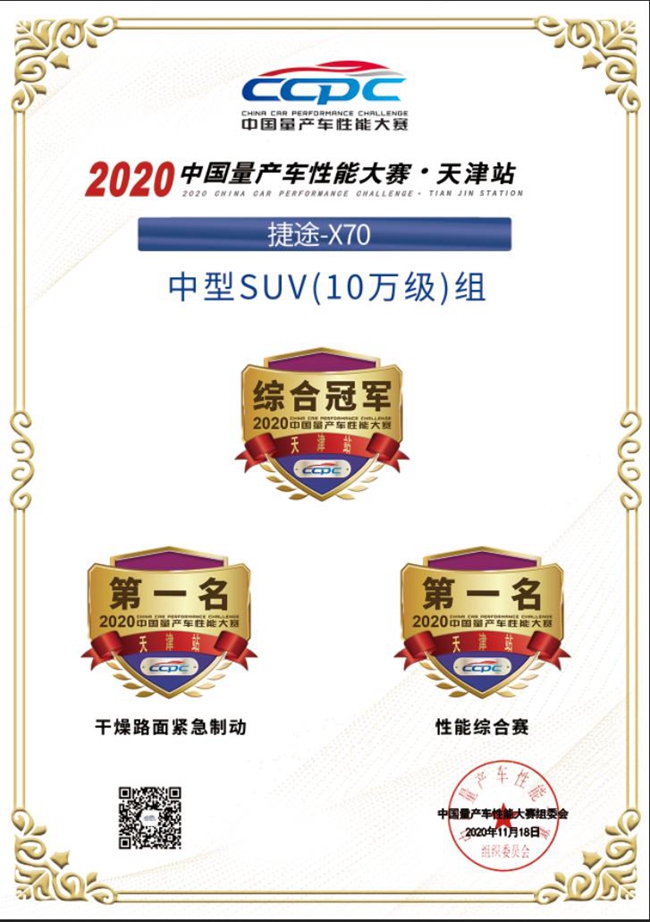 备受关注的2020 CCPC中国量产车性能大赛·天津站近期吸引了大量的目光,比赛吸引了一众主流汽车厂商参加,覆盖了轿车与SUV多种产品。历经两天的激烈角逐,最终捷途X70斩获“干燥路面紧急制动”、“性能综合赛”两个单项第一名,并获得中型SUV(10万级)组“综合冠军”,力拔群雄,实力不俗。