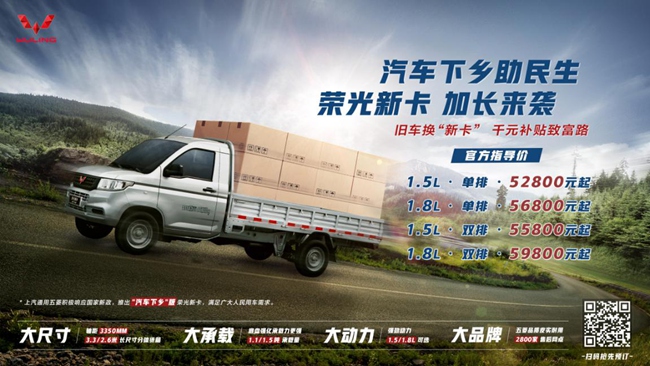 为积极响应国家开展新一轮汽车下乡政策号召,上汽通用五菱针对农村用户货运需求,推出“汽车下乡版”荣光新卡,于今日正式上市。新车具备尺寸更大、载重更大、动力充沛和安全舒适等优势,搭载1.5L、1.8L两种动力,售价为5.28-6.28万元,还可享受2000元置换补贴优惠。