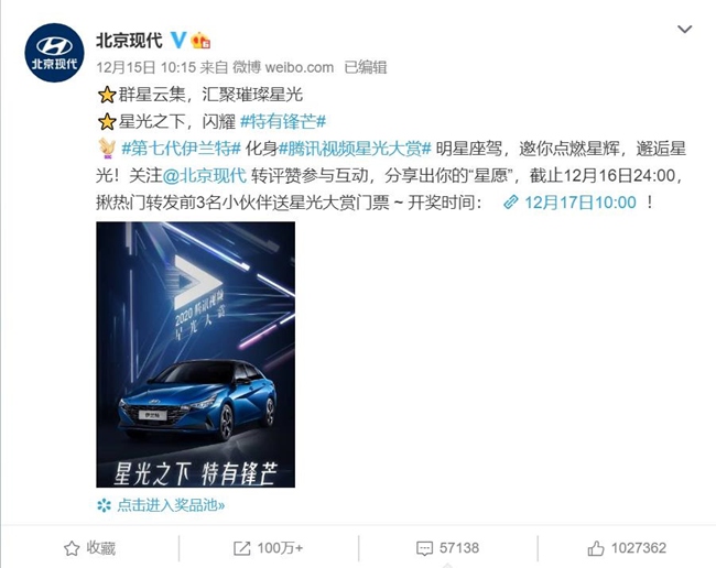 事实上,北京现代打造品牌年轻化形象的一系列“操作”都非常有温度、拉好感。就拿“顶流”云集的娱乐年度盛典《星光大赏》来说,北京现代一则“转发微博送门票”的活动内容被狂转100万 次,爆赞102万,引起了粉丝群体的极大关注,成功“出圈”。而现在,《星光大赏》的热度还未完全褪去,《温暖的抱抱》就来接棒“升温”,营销节奏非常密集。