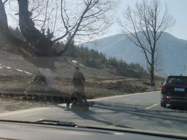 路遇两位虔诚的朝拜者——磕长头的藏民,看过很多关于藏民的片子,他们的眼神总是清澈、透明,面容祥和、从容不迫,折射出他们内心的安详和富足,没有被膨胀的欲望和占有欲所侵蚀,也让我想起那句话:有信仰的人是幸福的。