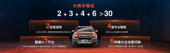 哈弗大狗2.0T四驱车型因为一条广为认知的不等式“2 3 4 6>30”,而成了一款被网友戏称“最不懂数学,但是最懂用户”的车型。这个公式助力年轻群体全面开启3/4刻度生活,对于平日的上班族来说,他们需要城市SUV的“驾驶舒适、油耗经济”,也需要”去野“的利器。3/4刻度生活无缝链接、瞬间切换。