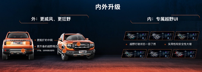 外观方面,2.0T四驱版车型的辨识度更高、更加野性十足。车身相比于1.5T版本也更长; 车顶山峰造型的鲨鱼鳍线采用纯黑设计; 轮毂采用五福铠甲式; 车门下方、后保险杠下新增了“川流式”装饰线,并且2.0T四驱版还将提供两道格栅的霸气选装件。