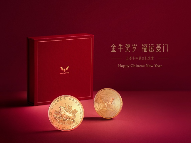 五菱牛年鎏金纪念章在细微之处尽显高超工艺,方寸之间尽显艺术灵感,正面雕刻“金牛献瑞”造型与金色繁花图案,四周镌刻“WULING·2021·WULING”及“人民五菱,有你更牛”祝福语,背面以五菱LOGO标识为中心,向四面散射黄金直线,彰显五菱和人民在2021年一起“牛”气冲天的美好希翼。