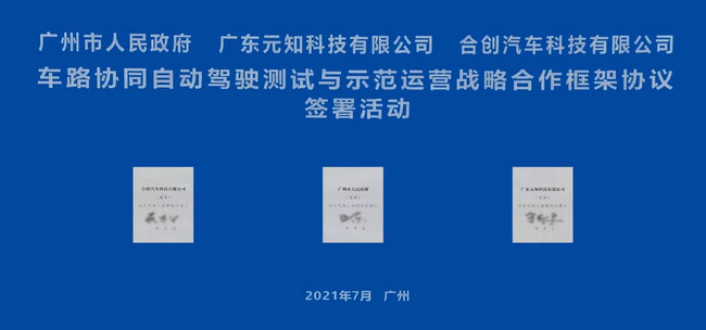 7月29日,广州市人民政府与合创汽车科技有限公司(以下简称合创汽车)、广东元知科技有限公司(以下简称元知科技)签署《车路协同自动驾驶测试与示范运营战略合作框架协议》。广州市温国辉市长与来自上海交通大学、元知科技、广汽集团及合创汽车的多位嘉宾座谈,并见证协议签署。