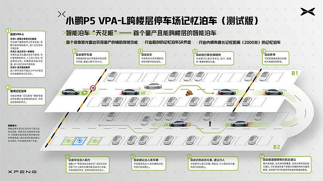 VPA-L跨楼层停车场记忆泊车支持用户学习和使用带坡道的跨楼层路线,记忆泊车距离从原来的“最后一公里”升级为“最后两公里”,也是目前业内最长的记忆距离。VPA-L克服了多项行业技术难点,通过激光雷达具有厘米级测距、全天候场景覆盖、空间分辨率高等特点,强化了坡道障碍物和距离的精准识别能力,解决以往毫米波雷达在地库使用中被过多信息干扰、对坡道下障碍物位置和距离识别不准的问题;同时,在保证安全的前提下,VPA-L综合考虑了坡道溜车场景与体验问题,更好地完成坡道运动控制;此外,为了拓展记忆泊车的建图里程,小鹏也在云端处理能力上持续发力,让记忆泊车功能的体验与适用场景获得双倍升级。
