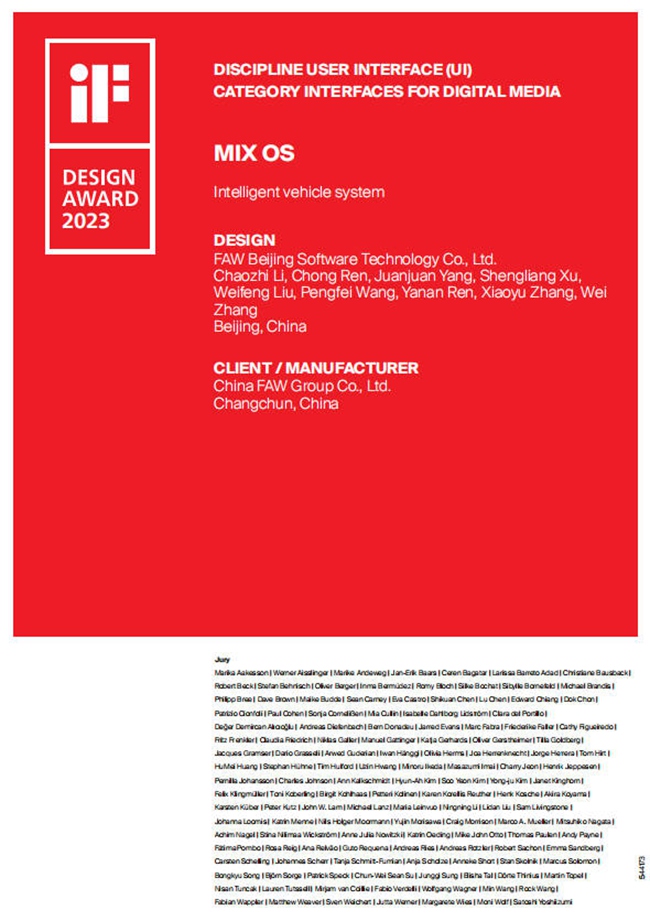 4月20日,中国一汽研发总院软件工程研究院一汽(北京)软件科技有限公司体验设计团队全自主创作的前瞻智能汽车操作系统《MIX OS》荣获iF DESIGN AWARD国际大奖。《MIX OS》以其未来前瞻性的设计理念和优异的用户体验设计细节获得了全球评委们的高度认可。