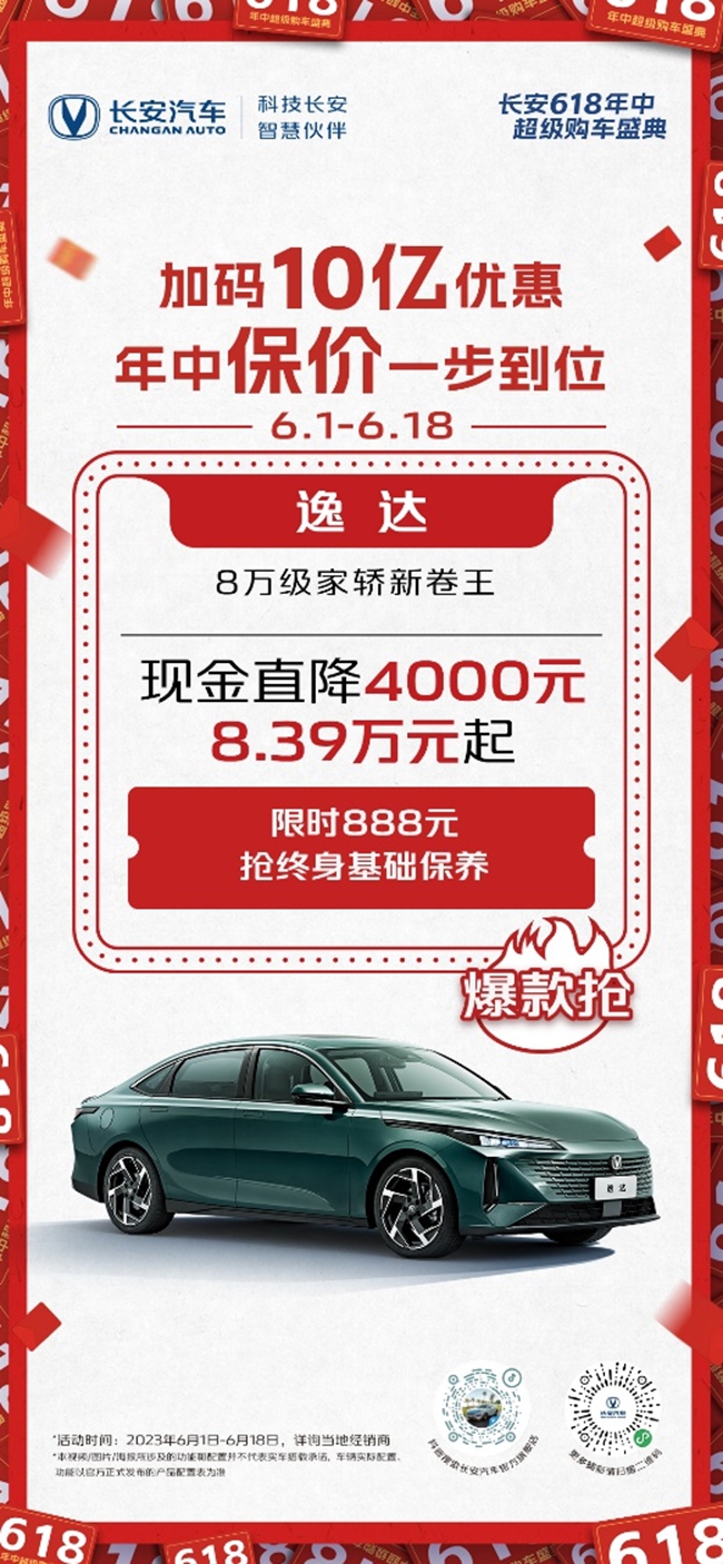 同时,叠加“年中保价”政策,不怕买贵!保障用户权益,免除买车后顾之忧。此外,长安汽车还针对逸达推出888元抢终身基础保养活动,不仅买车省,用车更省!有购车打算的朋友们,薅羊毛要趁早,超值“上车”良机千万不要错过!赶紧打开抖音搜索“长安汽车官方旗舰店”参与限时抢购,更多超值福利等你赢!全国线下门店同步火热进行中!