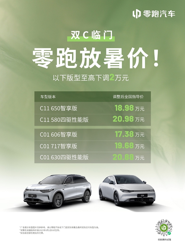 8月1日,零跑汽车官方宣布,调整C01 606智享版、717智享版、630四驱性能版以及C11 650智享版、580四驱性能版在内的多款C系列车型官方指导售价,调价幅度最高为2万元。