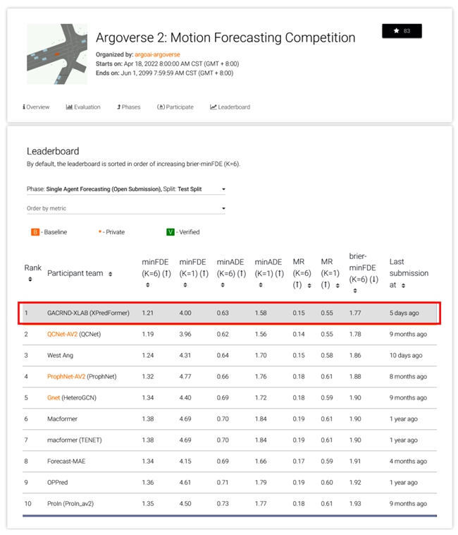 Argoverse 2运动预测挑战赛排行榜,广汽XPredFormer名列运动轨迹预测榜单第一