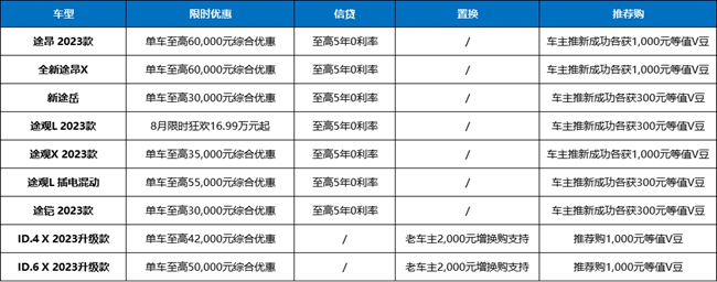 近日,上汽大众SUV家族推出限时福利,单车至高综合优惠6万元,更有至高5年0利率、车主推新成功获V豆和老车主增换购为福利加持。本次活动从即日起持续至8月31日,涵盖途昂2023款、全新途昂X、新途岳、途观L2023款、途观X2023款、途观L插电混动、途铠2023款、ID.4X 2023升级款、ID.6X 2023升级款9款热门车型,详情请洽当地经销商。