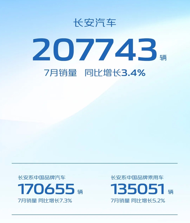 8月8日,长安汽车发布销量快报,长安汽车集团7月销量突破20万辆,1-7月累计销量达142万辆,同比增长7.3%,在传统车市淡季仍保持了良好增长态势。其中,长安系中国品牌汽车7月销量突破17万辆,同比增长7.3%;长安系中国品牌乘用车7月销量13.5万辆,同比增长5.2%,1-7月累计销量超90万辆,同比增长19.2%,自主乘用车保持迅猛发展势头。