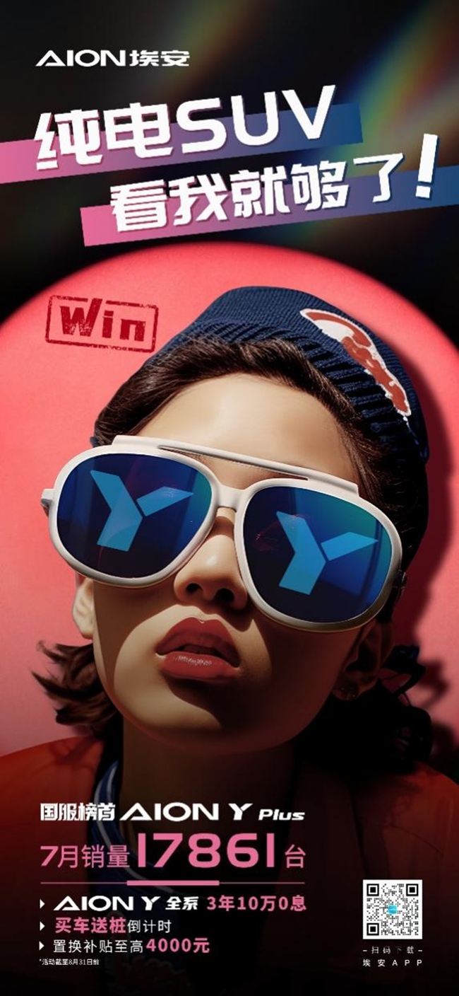 其中作为埃安的销量主力军,国服榜首AION Y系列保持高价值热销,7月销量达到17861台,继续引领纯电SUV市场;同时在今年1-7月,AION Y系列累计销量达到10,9824台。凭借AION Y Younger AION Y Plus的“双车策略”,AION Y系列持续圈粉年轻人,开创全新“YY时代”。