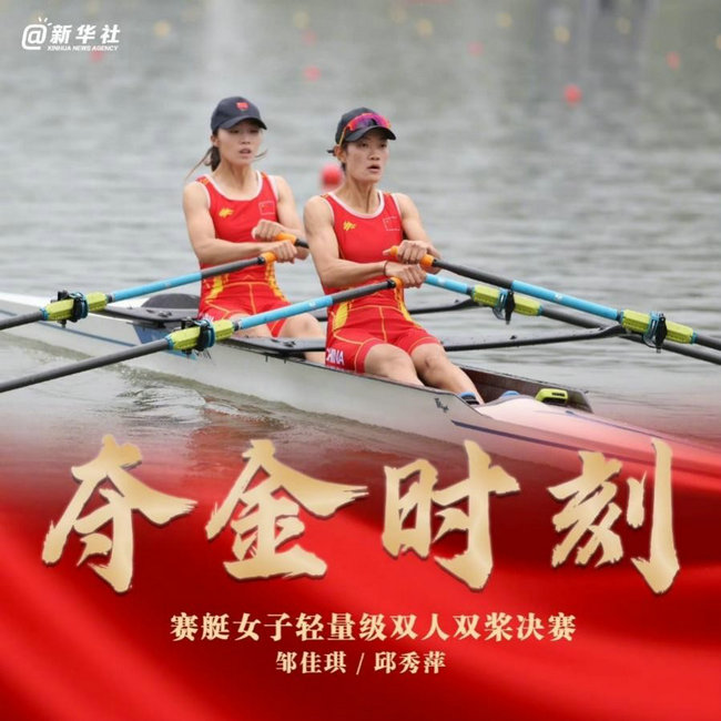 在赛艇女子轻量级双人双桨决赛中,中国选手邹佳琪和邱秀萍以7分06秒78的成绩夺得冠军,摘得杭州亚运会首块金牌,赢得开门红!这也是中国队连续六届夺得亚运会首金。