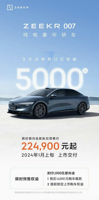 今日,极氪智能科技旗下首款纯电豪华轿车极氪007首次全球公开亮相,并在2023广州车展同步开启预售,新车预售价为22.99万元起,上市发布前支付1000元意向金,将可享受“6000元购车尾款抵扣”的限时意向金膨胀权益,抵扣后预售价22.49万元起,同时可提前锁定上市购车权益。新车将于2024年1月上市交付,即日起用户可通过极氪官方渠道了解车型详情并预订。