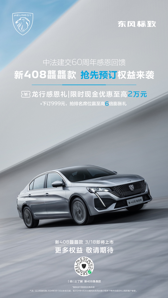 3月13日,为了庆祝中法建交60周年,感恩回馈客户,加速践行“五心守护伴知音”承诺,东风标致在“东风标致索肖社区”小程序开启新408龘龘款抢先预订,推出“龙行感恩礼”,下订999元,抢排名席位赢至高6倍膨胀礼,限时现金优惠至高20000元(含膨胀礼)。