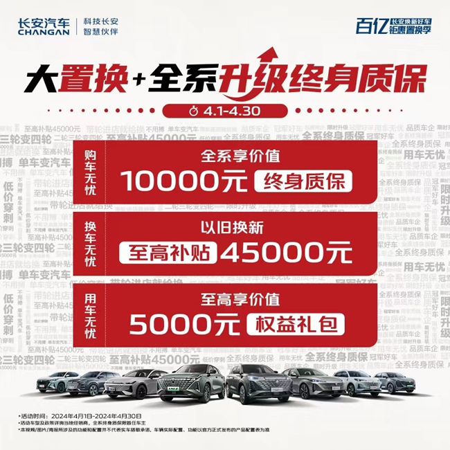 此次长安全系大置换 全系升级终身质保活动,涵盖了购车、换车、用车全生命链路,为用户提供了覆盖全生命周期的高价值服务与保障,且优惠力度前所未有,堪称天花板级别,以超越用户期待的实惠减轻购车、用车的经济压力,给到用户一个轻松购车、换车,升级出行体验的机会。长安全系车型也将让用户在外观设计、动力性能、智能座舱及安全保障方面获得物超所值的驾乘体验之外,体验到更多新技术带来的驾驶乐趣。